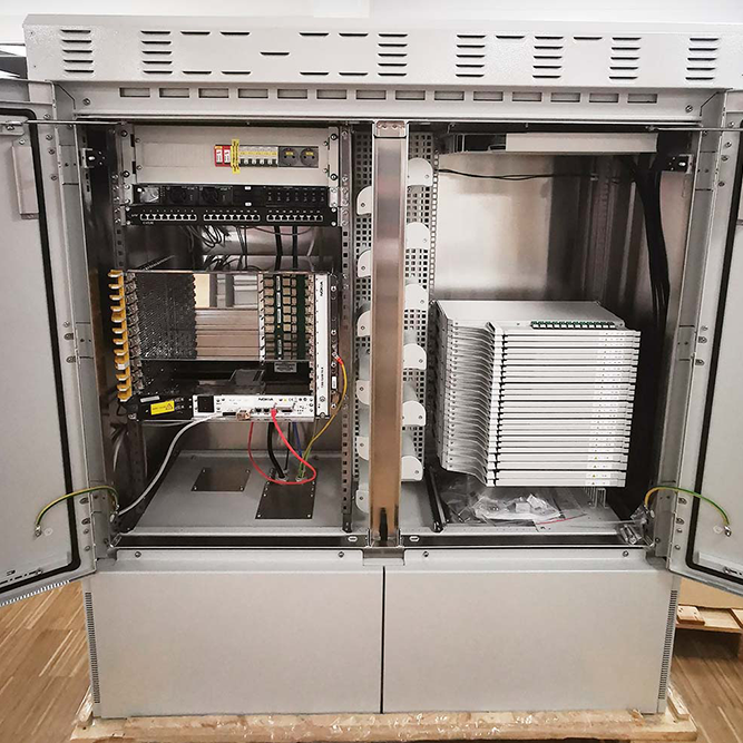 Connect Com bietet Multifunktionsgehäuse an, die individuell nach Kundenwunsch vorkonfektioniert werden. Das Besondere: Auch Systemkomponenten verschiedener Drittanbieter werden vorinstalliert, beispielsweise die Stromversorgungseinheit oder sogenannte Shelfs für den OLT, den Ausgangspunkt für das passive optische Netzwerk. Connect Com baut alle erforderlichen Aktiv- und Passivkomponenten im Verteilgehäuse ein, übernimmt die Vorverdrahtung nach kundenspezifischen Vorgaben sowie die Vorprogrammierung der aktiven Komponenten. Abschliessend unterziehen wir das komplett verdrahtete MFG einer VDE-Prüfung.