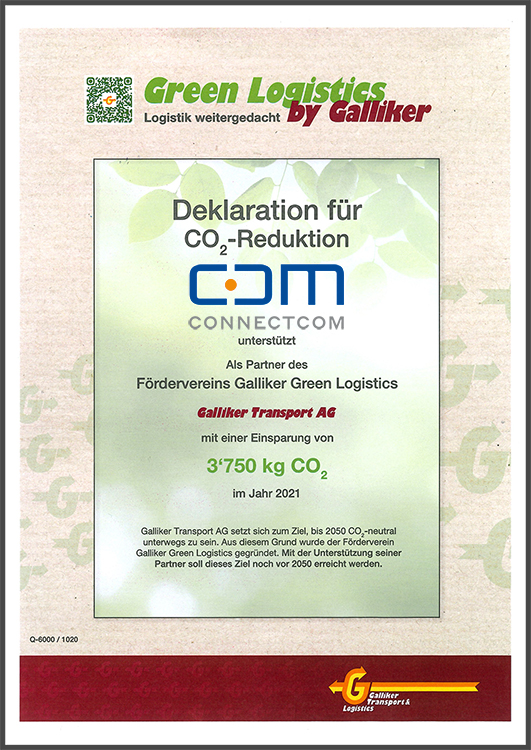 Seit März 2021 Ist Connect Com AG Mitglied des Fördervereins "Galliker Green Logistics". So investieren wir gemeinsam mit unserem Haupt-Spediteur in CO2-neutrale LKWs. Konkret werden LKW's mit Dieselmotor durch Fahrzeuge mit Elektro-, Wasserstoff- oder anderen nachhaltigen Antrieben ersetzt. Dies unter dem Motto: "Gemeinsam kommen wir weiter".