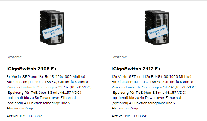 Die iGigaSwitch 24xx E+ Familie wurde für die Installation von robusten und zuverlässigen Netzwerken in rauen Umgebungen designt. Sie bietet dabei grosse Flexibilität beim Netzwerkdesign, denn sie hat 24 Gigabit Ports, einschliesslich 4, 8 oder 12 SFP-Ports. Sie wurde entwickelt, um maximale Verfügbarkeit, Sicherheit und längste Lebensdauer zu gewährleisten sowie die Wartung des Netzwerks zu vereinfachen. (verfügbar ab Q4 2024)