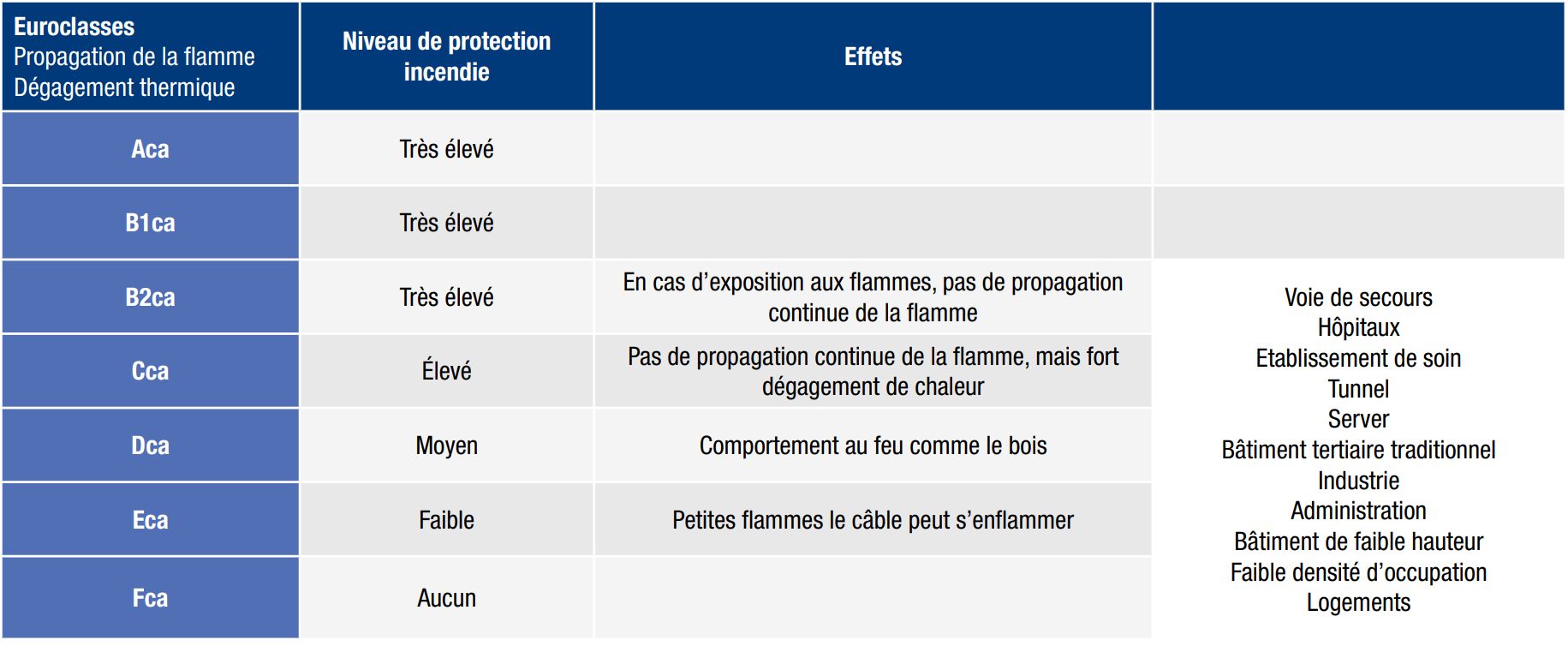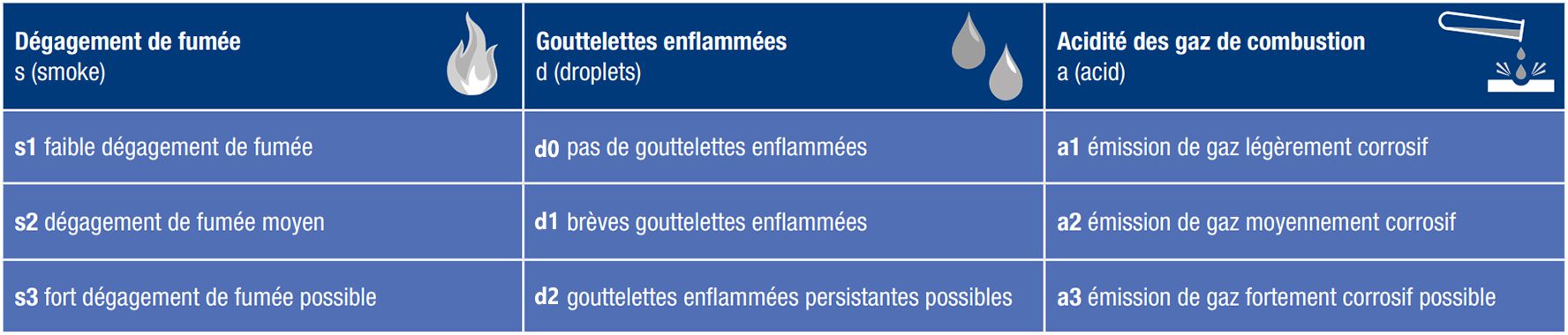 Les euroclasses sont attribuées sur la base des critères de dégagement de chaleur et de propagation des flammes. Il existe des classes supplémentaires pour les exigences supplémentaires telles que le dégagement de fumée (s), la formation de gouttes enflammées ou la chute (d) et l'acidité des gaz de combustion (a). Pour les câbles d'énergie, de commande et de communication dans les bâtiments, de nouvelles classifications sont depuis prescrites selon différents critères (dégagement de chaleur et propagation de la flamme, etc.). Sur la base de cette classification, le ZVEI a émis des recommandations concernant les câbles à utiliser et les classes de feu. La règle générale est la suivante : plus le bâtiment est grand, plus le besoin de sécurité est élevé.