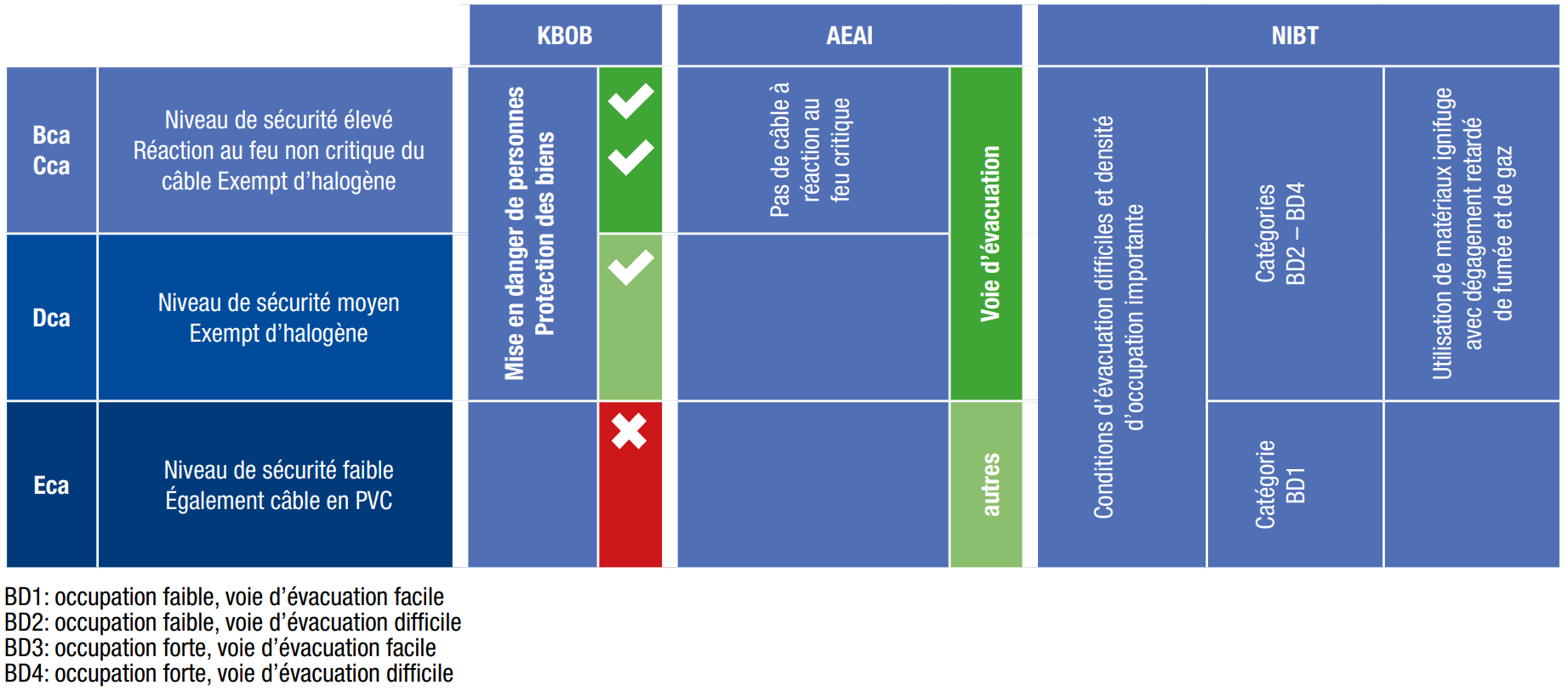 La classification s'applique principalement aux câbles internes. Plus les prescriptions de protection incendie sont élevées, plus les exigences posées au câble le sont également. La classification est déterminée par la police du feu et les assurances des bâtiments ou définie par le maître d'ouvrage ou le planificateur